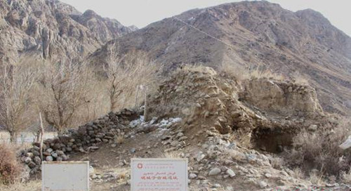 如今,已看不見古城的大門,只看到靠近城門墻的東邊是一個高臺,可以看見城墻是以卵礫石和黃泥土混筑,中間還夾雜一層木條或樹枝,北面和西面的山崖之間連接一道石頭砌成的欄墻,一直延伸到兩邊的山體,由此可見,古城和欄墻構(gòu)筑了一座易守難攻的關(guān)隘。